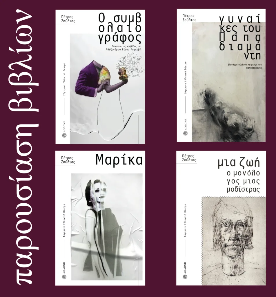 Τη Δευτέρα 9 Μαρτίου και ώρα 18:30, οι εκδόσεις Δωδώνη σας προσκαλούν στην παρουσίαση των θεατρικών έργων του Πέτρου Ζούλια στο Art 63, Χώρος Τέχνης (3ης Σεπτεμβρίου 63, Αθήνα) Μαρίκα. Ένα έργο βασισμένο στη ζωή της Μαρίκας Κοτοπούλη Ο Συμβολαιογράφος. Θεατρική διασκευή της νουβέλας του Αλέξανδρου Ρίζου Ραγκαβή Γυναίκες του Παπαδιαμάντη, ελέυθερη σύνθεση κειμένων του […]