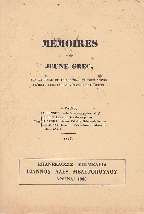 Memoires d’un jeune Grec, sur la prise de Tripolizza et pour servir a l’histoire de la regeneration de la Grece