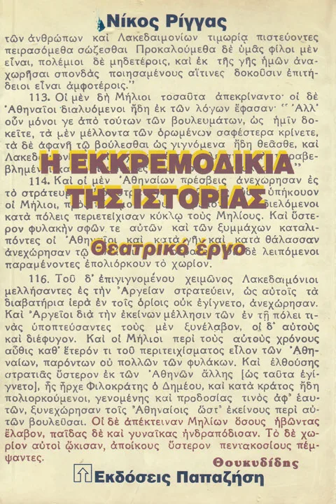 Και ας μην παρασύρονται οι άφρονες από την τεχνολογική διάσταση της δύναμης, διότι η αλαζονεία της ισχύος, όπως κατάστρεψε την Αθήνα, τη Ρώμη, το Βυζάντιο, την Οθωμανική, τη Βρετανική, τη Γαλλική, την Ισπανική αυτοκρατορία, έτσι θα καταστρέψει και τη σημερινή ηγεμονίδα της οικουμένης· γιατί η αυτοκαταστροφή είναι το τίμημα της υπεροψίας, της βίας και της αδικίας. Αυτό το θέμα διαπραγματεύεται Η εκκρεμοδικία της ιστορίας, με την οποία συμπληρώνεται η θεατρική μου τριλογία, μέσα στην οποία το παρόν συζητάει ιστορικά, ποιητικά και επαναστατικά με το παρελθόν, το μέλλον και τον εαυτό του και έχει για άξονα τη δραματική διαχρονική πορεία του ανθρώπου με το γιατί και το διότι αυτής της συνεχιζόμενης τραγωδίας.