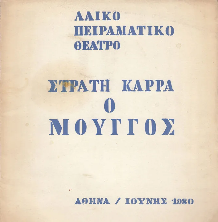 Πρόγραμμα της παράστασης Ο μουγγός του Στρατή Καρρά από το Λαϊκό Πειραματικό Θέατρο στο Θέατρο Πορεία, σε σκηνοθεσία Λεωνίδα Τριβιζά. Με συμπληρωματικά κείμενα, φωτογραφικό υλικό και αναφορά των συντελεστών. Περιλαμβάνει το κείμενο της παράστασης.