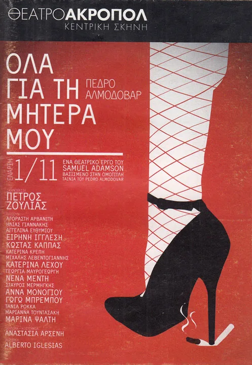 Πρόγραμμα-αφίσα των παραστάσεων Όλα για τη μητέρα μου του Πέδρο Αλμοδοβάρ (μεταφορά του θεατρικού έργου του Samuel Adamson) σε σκηνοθεσία Πέτρου Ζούλια και Ο έμπορος της Βενετίας του Ουίλιαμ Σαίξπηρ σε σκηνοθεσία Σπύρου Α. Ευαγγελάτου από το Θέατρο Ακροπόλ. Με σύντομη εισαγωγή, φωτογραφικό υλικό και αναφορά συντελεστών. Δεν περιλαμβάνει το κείμενο της παράστασης.